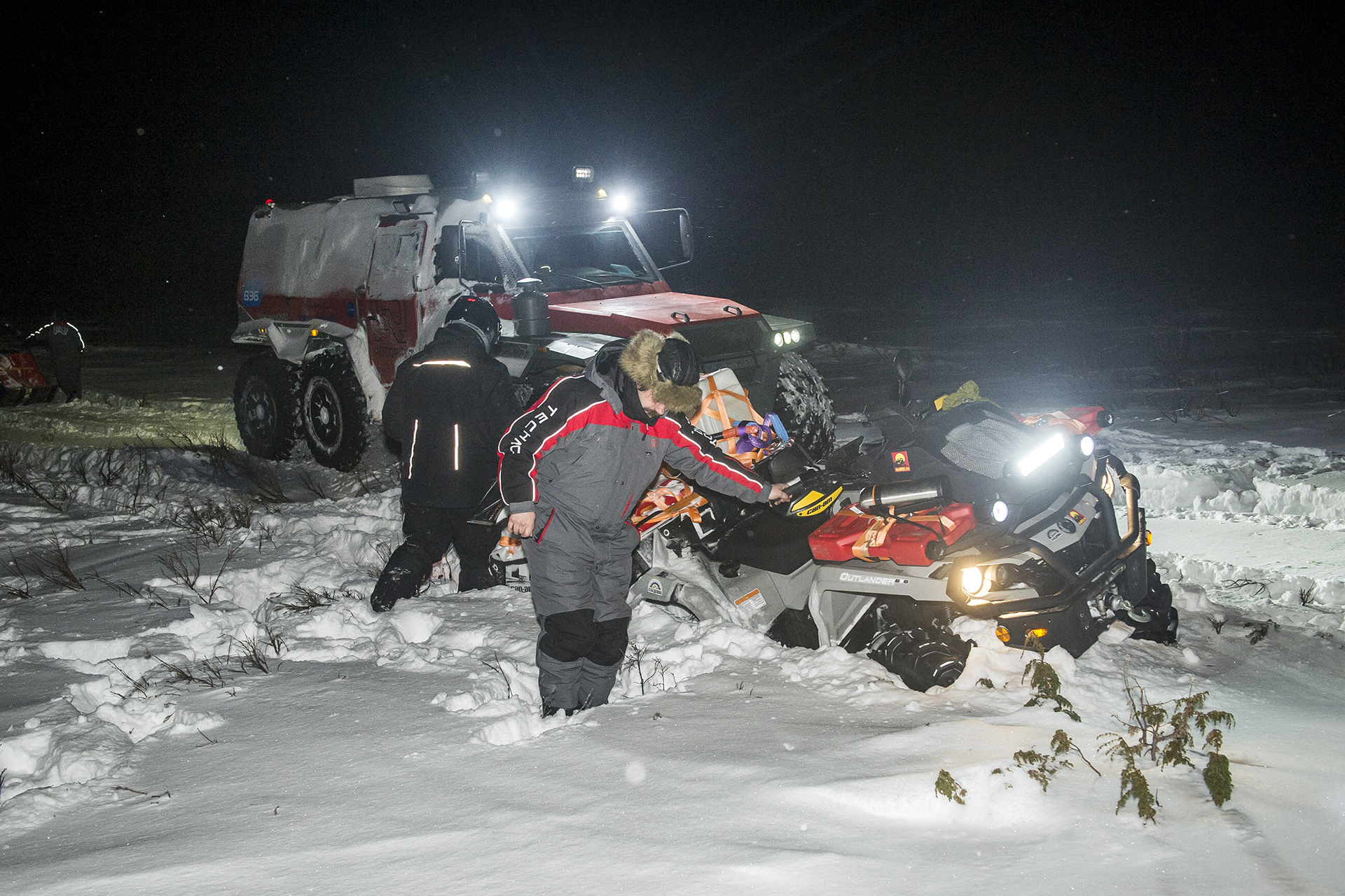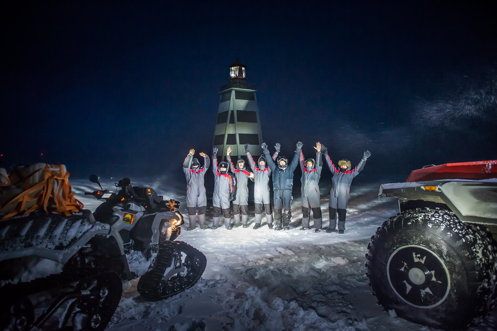 We arrived at Canin Nos! The day before, on March 12 at 5 o’clock in the morning we reached the lighthouse. People and the equipment made it! The road from Shoyna was not particularly difficult, but the biggest part of the trip was made in full darkness and it was not easy to navigate, but there was a navigator! The ice on the rivers was strong - we moved without any problems, although at first there were thoughts of moving away from the sea in order to move to the other shore more safely. Then we drove out to the ice of rivers and streams without fear. We heard about the crevices covered by snow, but somehow we did not notice them. But Shaman got stuck in soft fluffy snow a couple of times, in spite of his big wheels, however, with the help of the quad bike, used as an anchor for the rear winch, it was easy to get out of the trap. The most difficult place was a steep climb right after the Bolshaya Bugryanitsa river. The Shaman overcame this climb in a few steps, starting from the trodden track.